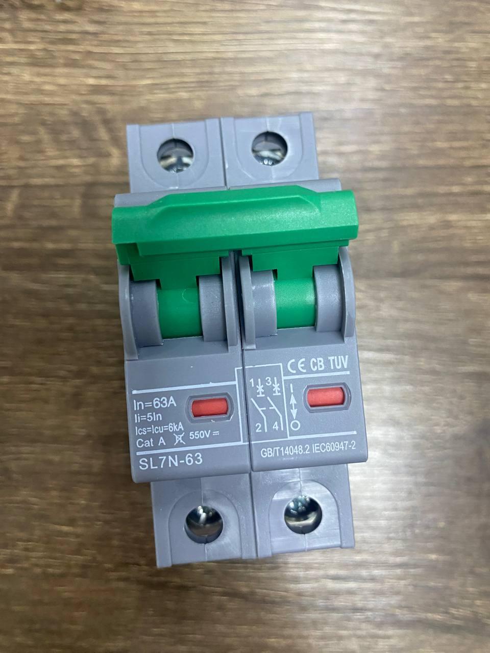 Підсумок: Автоматичний вимикач Suntree SL7N63 DC 2P C63A 550V DC є високоякісним і надійним пристроєм для захисту електричних систем постійного струму. Завдяки високим характеристикам по струму і напрузі, а також простоті установки і надійності, він забезпечує ефективний захист від коротких замикань та перевантажень. Це ідеальний вибір для використання в сонячних енергетичних установках та інших системах, що працюють на постійному струмі.